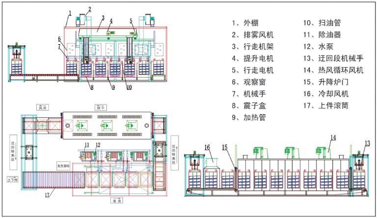 人工將工件首先放入小工件籃內(nèi),再將小工件籃放置于吊籃內(nèi),然后將吊籃放在上件處滾筒平臺上(自動定位)。整套設(shè)備由PLC可編程控制器控制,機械手自動將吊籃放入超聲波除油槽,清洗時間(節(jié)拍)根據(jù)工件的產(chǎn)量及工件的污染狀態(tài)可調(diào),到達設(shè)定時間后,機械手依次將吊籃放入下道清洗槽,直至將吊籃放入過渡區(qū)輸送鏈上:然后由迂回轉(zhuǎn)角機械手將吊籃放入烘干爐上件段輸送鏈上,經(jīng)烘干、風(fēng)冷,然后再由迂回轉(zhuǎn)角機械手將吊籃放入清洗段上件輸送滾筒上(注:設(shè)備上、下件為同一工位)。